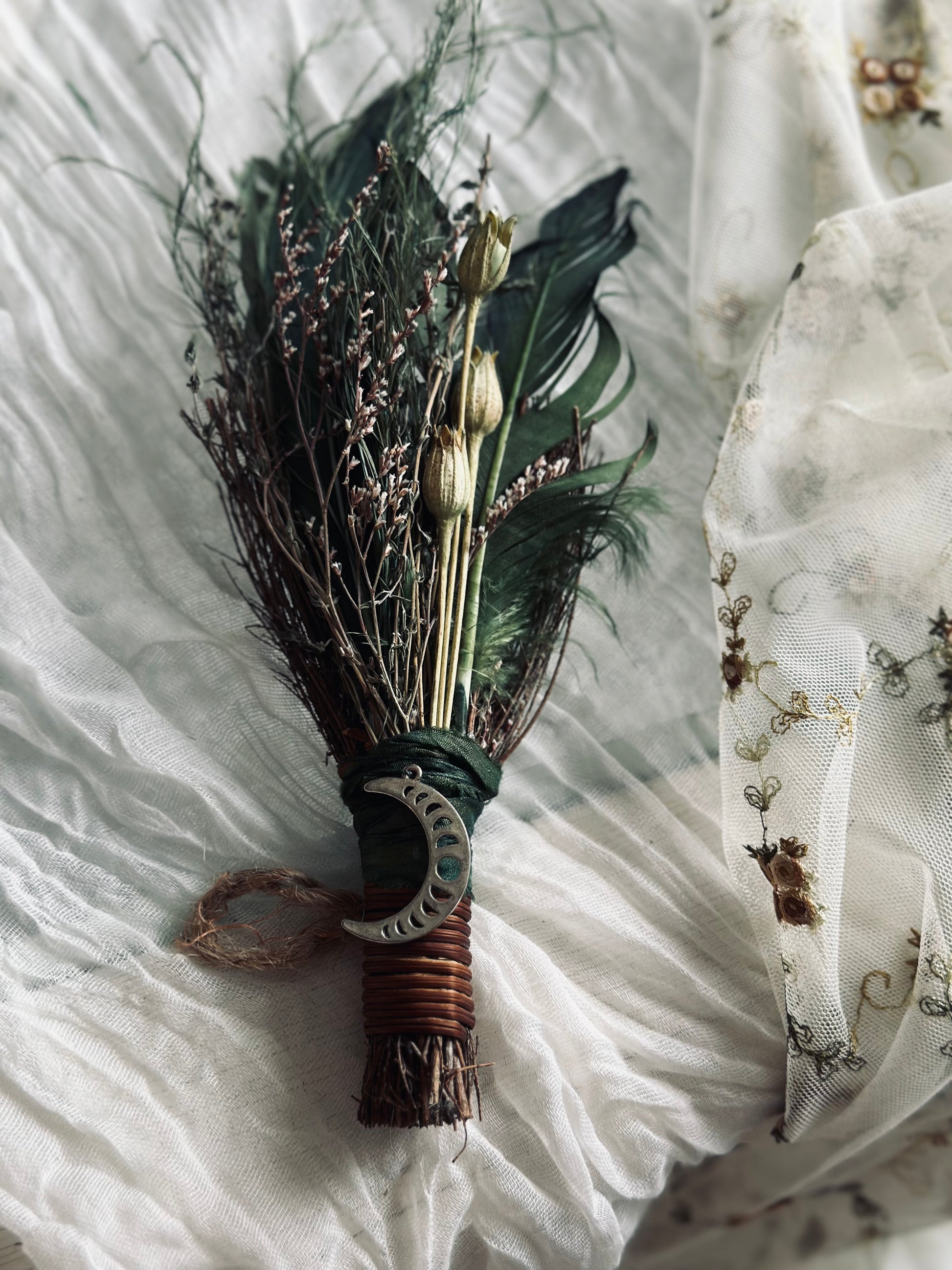 Infused with a blend of cinnamon and pine essential oils, this little beauty features hand dyed green feathers, herbs, dried evergreens, and florals woven throughout. A gorgeous green silk ribbon wraps around the handle, and a delicate moon charm dangles from the tip, symbolizing the magic of the lunar cycle.