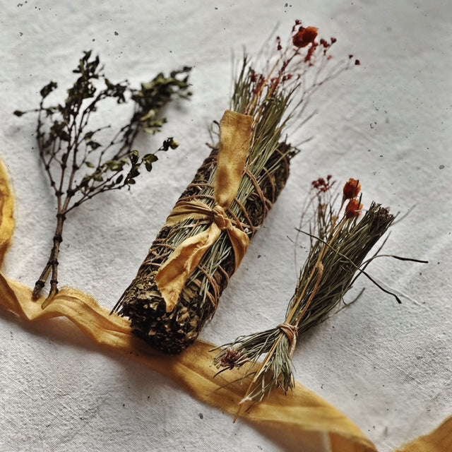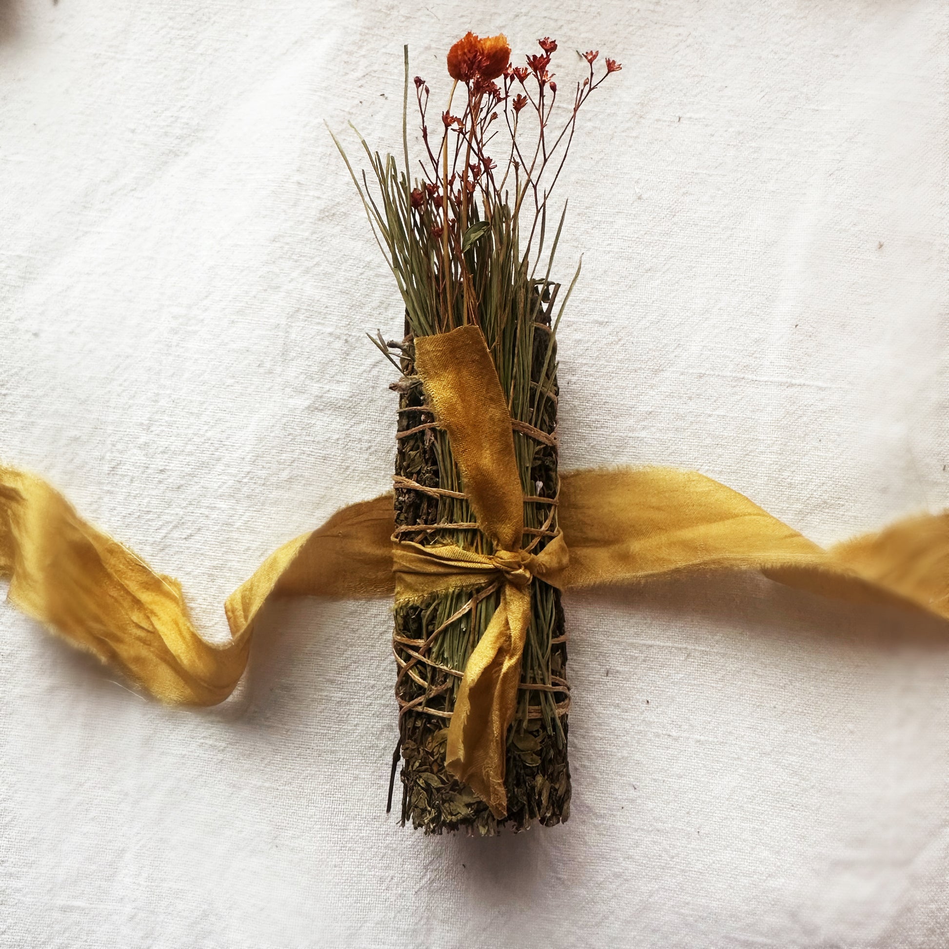 Wild harvested creosote, gathered responsibly after the storms, blended with sacred piñon pine and small wild bouquets of dried desert blooms. Each bundle is hand tied, the floral sprig rests gently, removable, so you may burn and offer the creosote on its own.