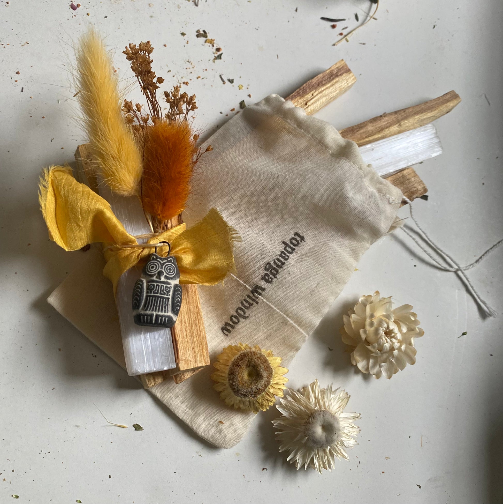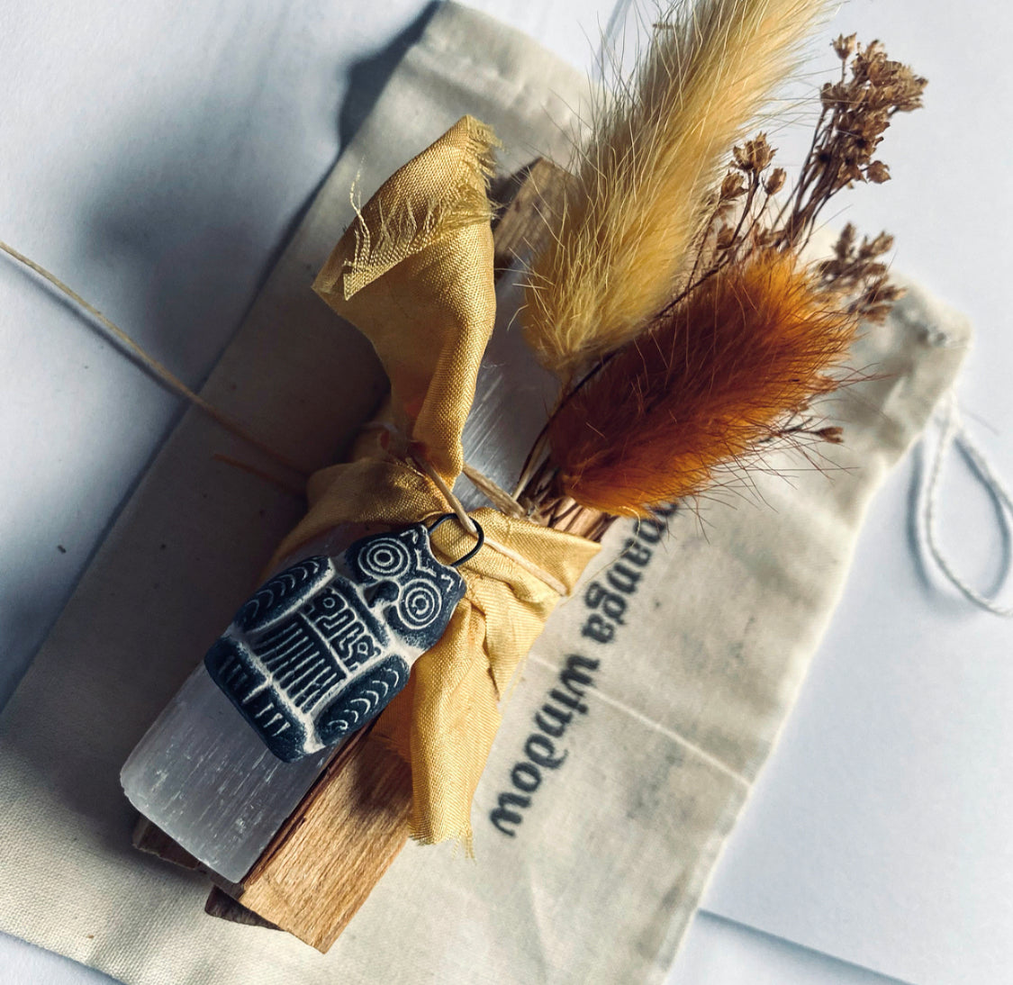 Each set includes a guide with the meaning and history of your Palo Santo, selenite, and amulet.