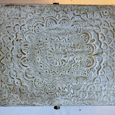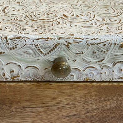 Wooden box is handcrafted in India and has a beautiful mandala floral design. Rich in texture and quality. A strong dense wood. Lovely details throughout box.