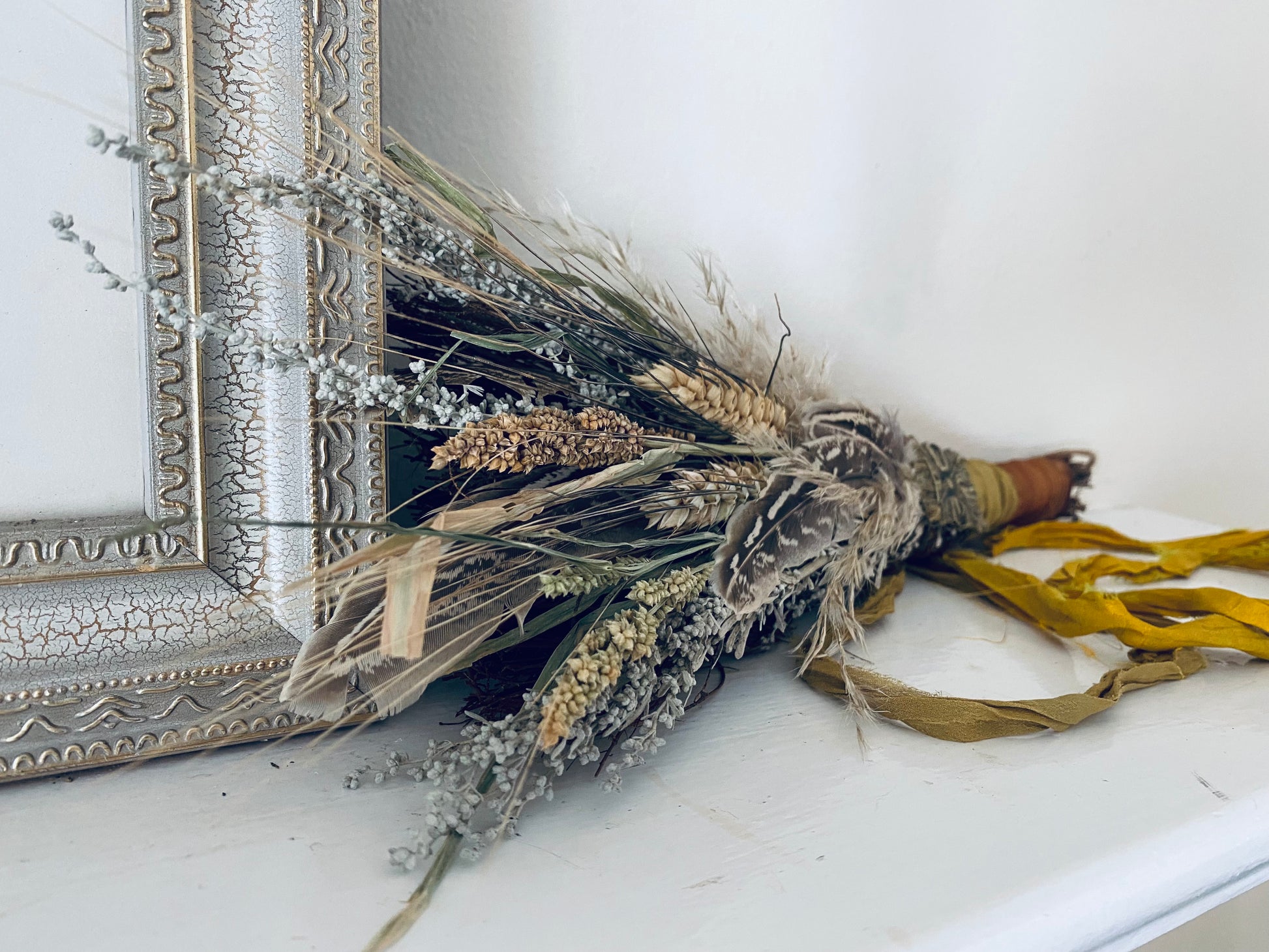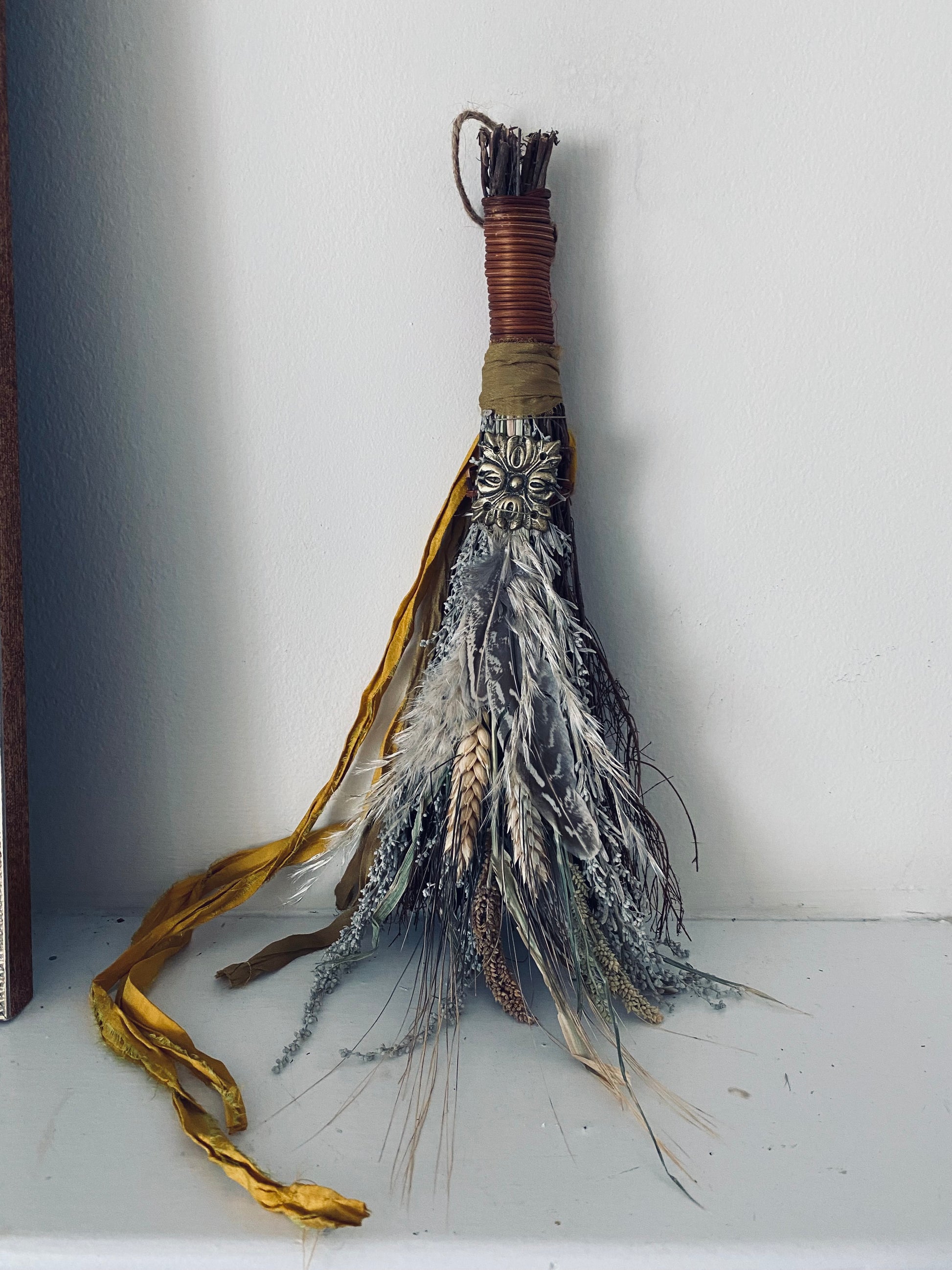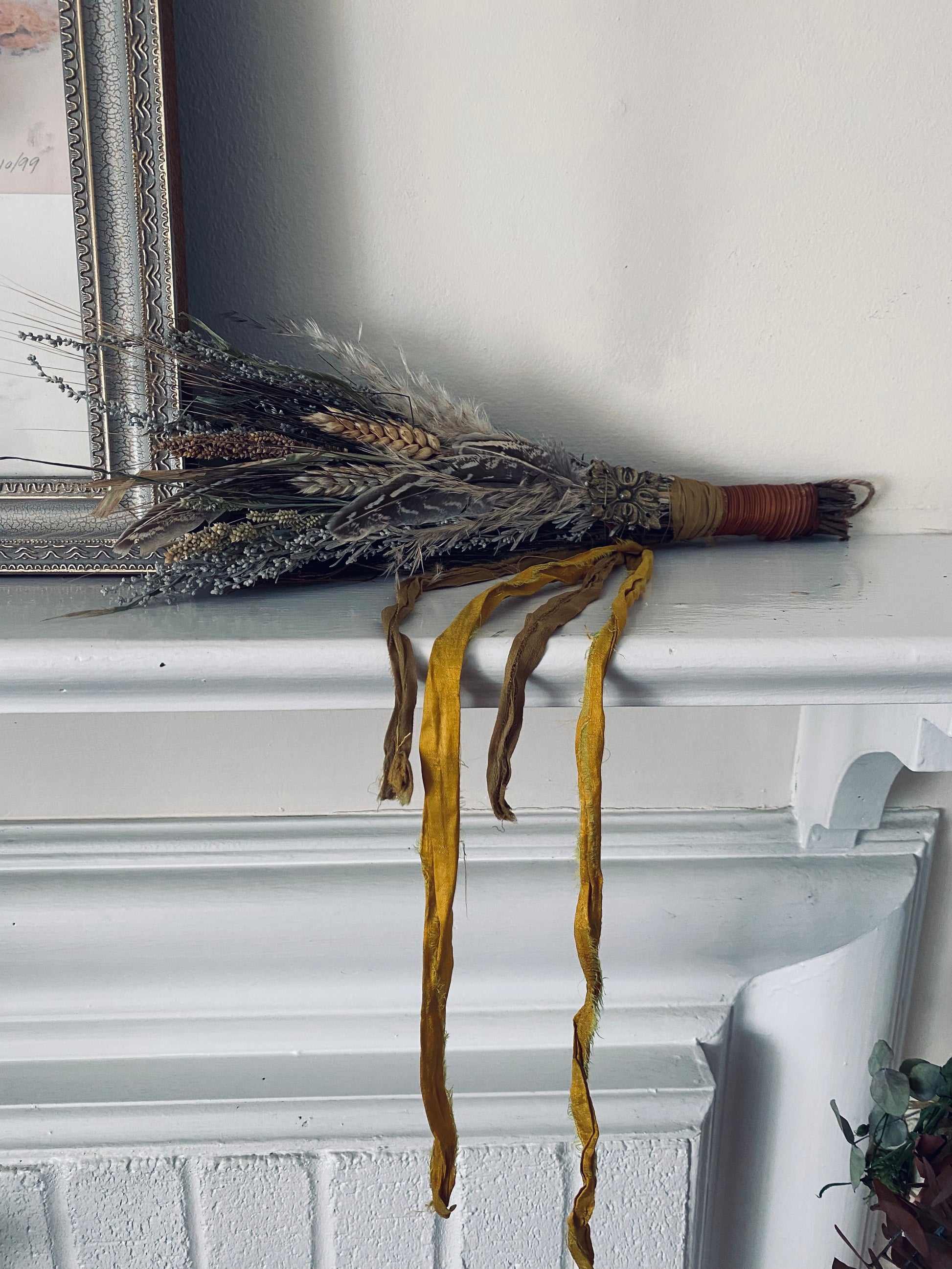Beautiful rustic charm. This broom is design with a mixed bouquet of harvest grains, dried wheat, oat & pampas. We chose a soft color pallet of gold, white and cream to decorate this fragrant cinnamon broom.