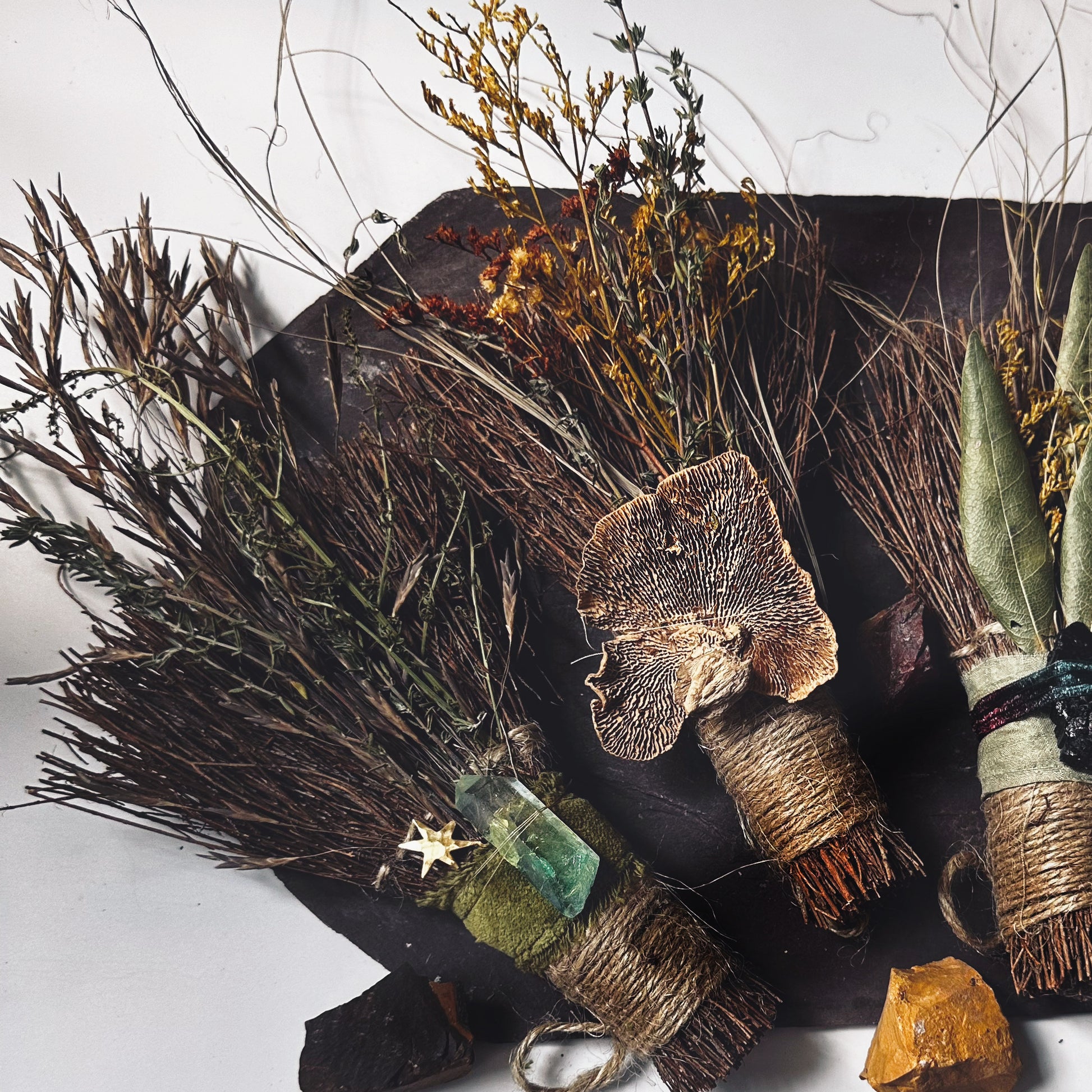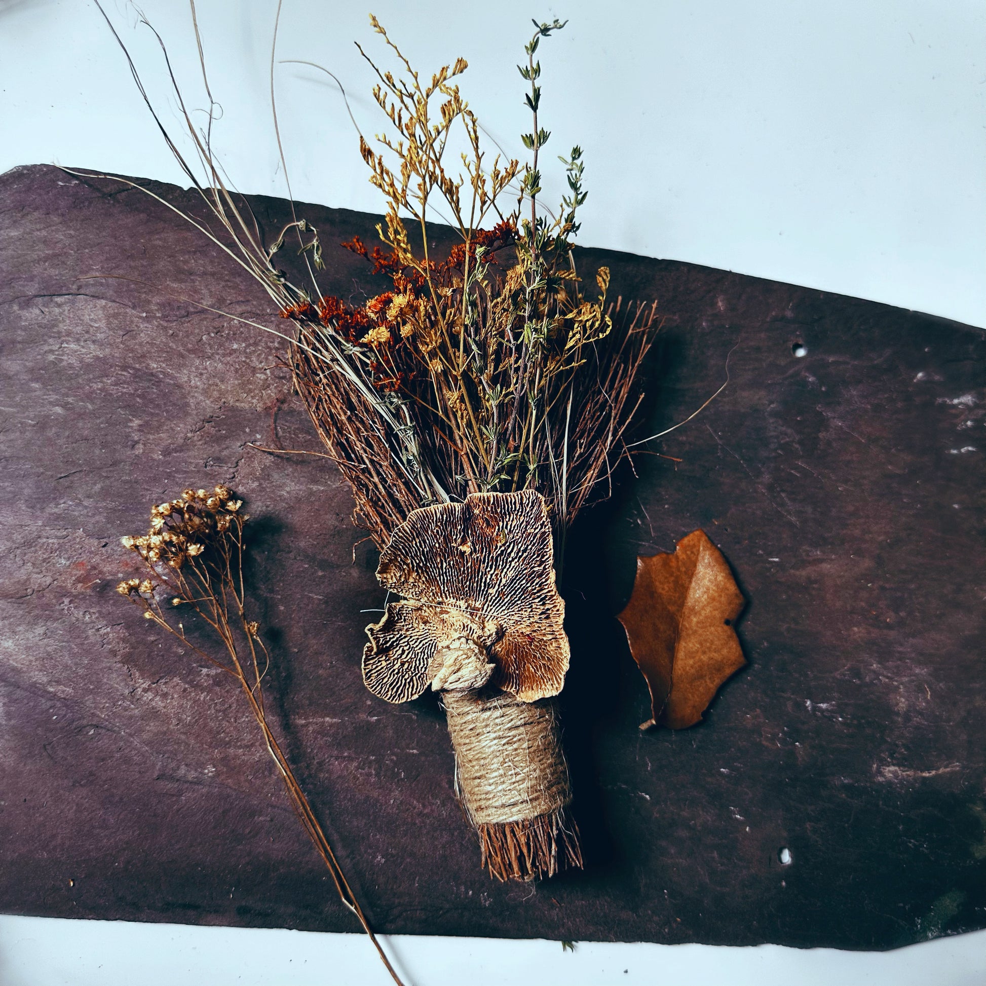Decorative cinnamon broom made with dried florals, thyme and dried mushroom.