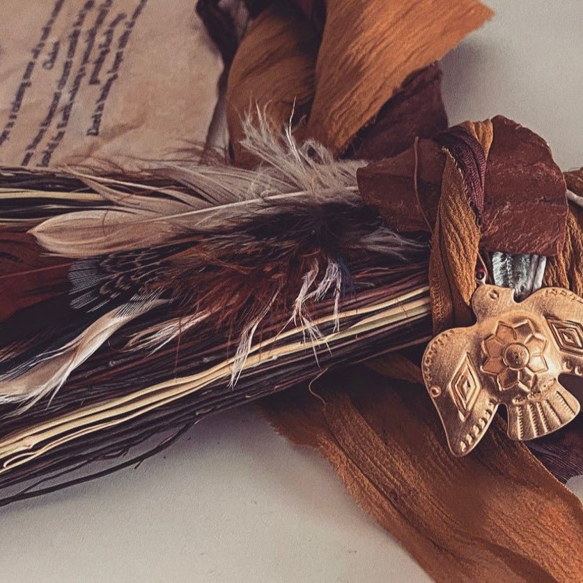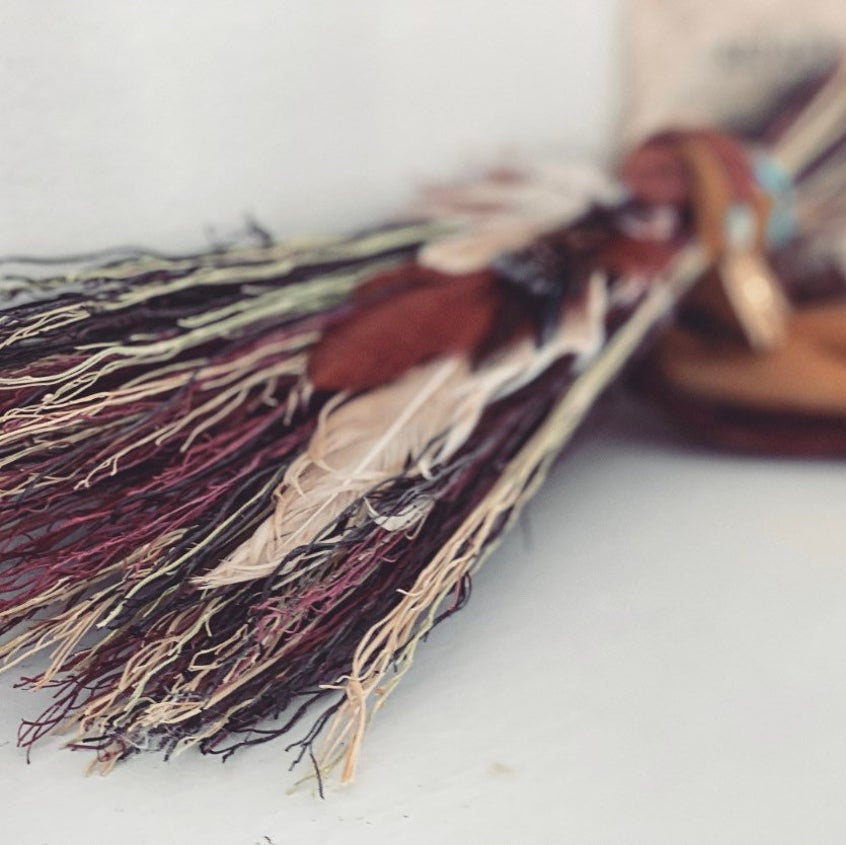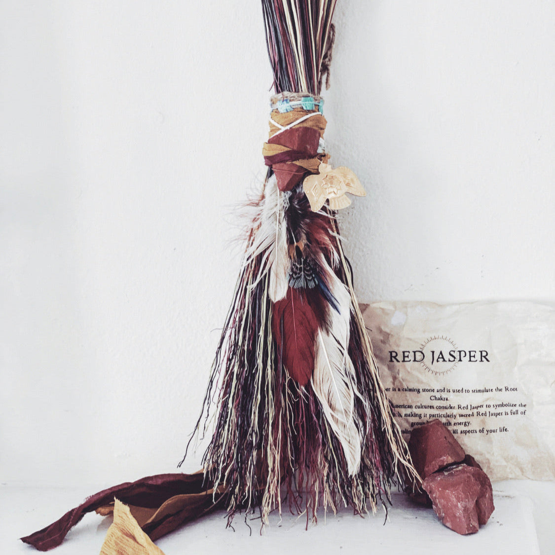 Hand dyed multi colored broom corn, feathers, and silk sari ribbons come together in harmony, reminiscent of the vibrant hues of the Sedona landscape. And to make it even more special, this piece is bundled with a thunderbird charm and a gorgeous Arizona Red Jasper stone, whose rich, earthy-red tone perfectly echoes the fiery red rock sunsets of Sedona.